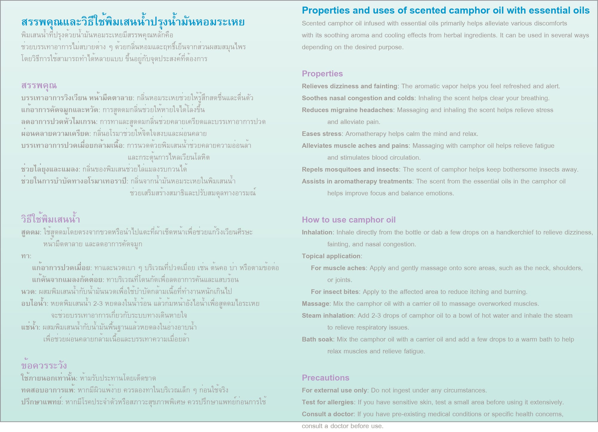 พิมเสนน้ำปรุงน้ำมันหอมระเหย ให้กลิ่นหอมดอกไม้ธรรมชาติผสมสมุนไพร ปราศจากสารเคมีที่เป็นอันตราย ใช้งานง่ายด้วยขนาดพกพาคล่องตัว เหมาะสำหรับการใช้รายละเอียดในวันประจำวันอย่างสะดวก